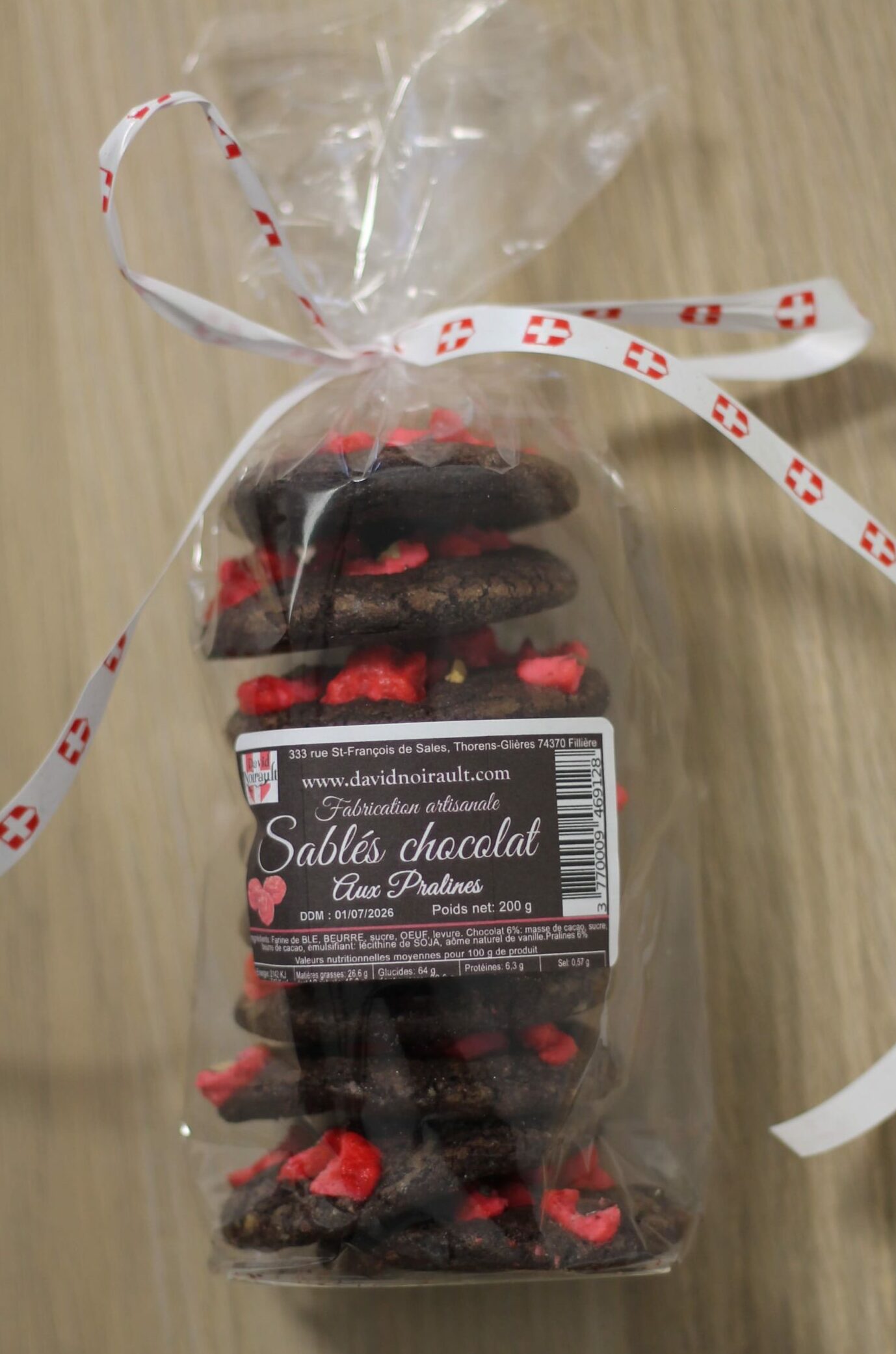 Nos sablés sont confectionnés avec du beurre frais de première qualité, un mélange délicat de sucre et de farine soigneusement travaillés, des œufs frais, du cacao de qualité et de véritables éclats de pralines qui apportent une touche caramélisée et croquante. Cette combinaison unique crée une texture friable à l’extérieur et fondante à l’intérieur. Ainsi, chaque bouchée révèle le mariage parfait entre chocolat intense et douceur des pralines.